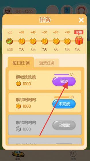 3、在任务界面,完成“解锁哈哈哈”等任务,点击“领取”获取金币,用于汽车养成、抽奖。