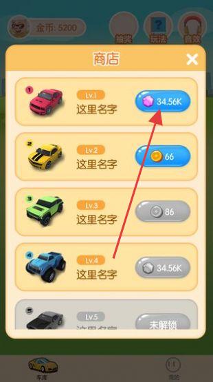 2、进入商店,用钻石(如34.56K)等货币,购买、升级不同等级汽车,提升车辆属性。