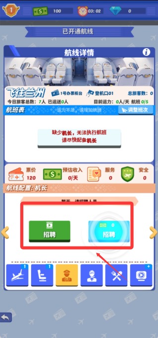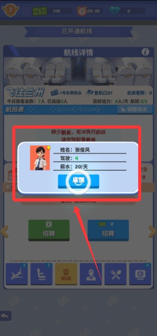 2、由于缺少机长,无法执行航班,要尽快招聘,点击下方按键招聘。
