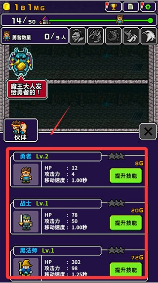 2、打开伙伴列表,可以查看当前的伙伴信息,而且还能提升他们的技能。