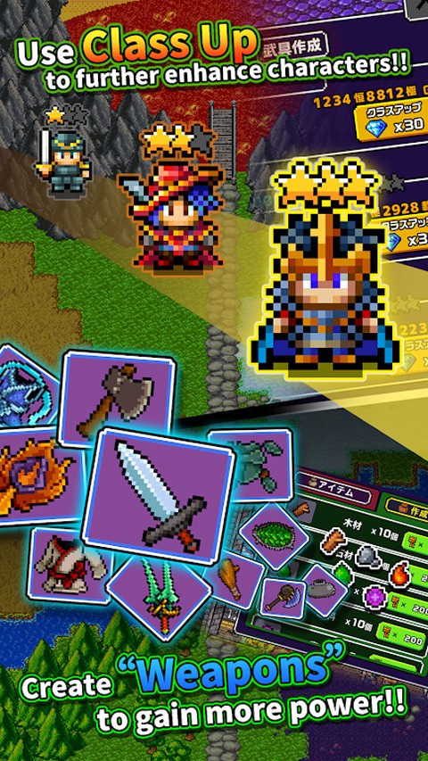 1、采用传统复古像素风格,将经典RPG元素与现代放置玩法融合,呈现出既怀旧又创新的视觉体验,让人瞬间回到童年时代的游戏厅。