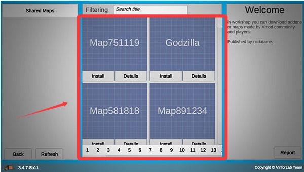2、可看到有不同的按钮选项,点击v模式沙盒上的“Addons”可以添加模组,自由开发,点击“Install”上传共享,“Details”删除模组。