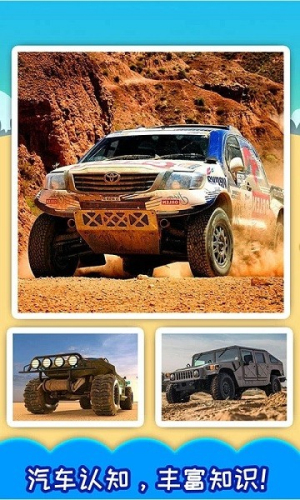 2、互动学习功能,完成拼图后显示车辆名称和用途介绍。部分车型配有简单动画演示,如挖掘机工作场景。