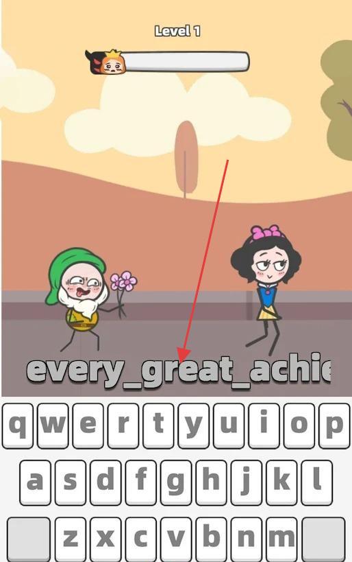 3、Level1关卡,结合角色(小矮人送花白雪公主),补全“every_great_achie”单词,解锁新关卡。