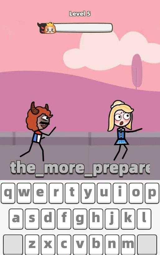 2、Level5关卡,依据人物(牛魔王与女孩)画面,用键盘补全“the_more_prepare”,完成挑战。