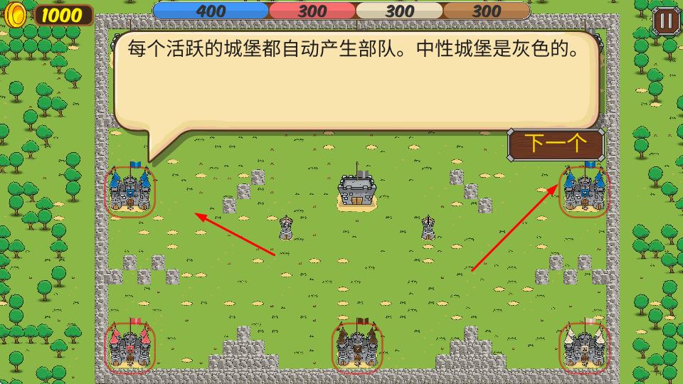 1、开局利用活跃城堡自动生产部队,点击“下一个”推进流程,派部队占领灰色中性城堡,扩张领地。