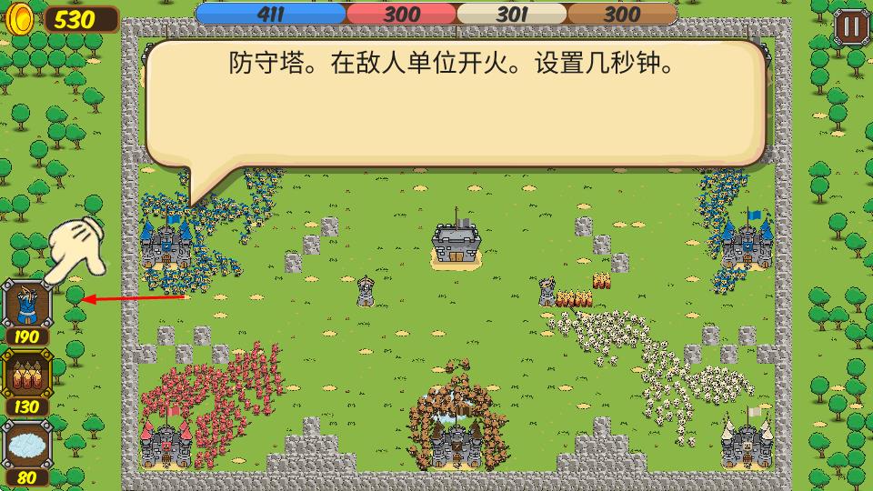 2、战斗时,拖动左侧防守塔(如190数值)到战场,布置在路径,对敌人单位开火,辅助防御。