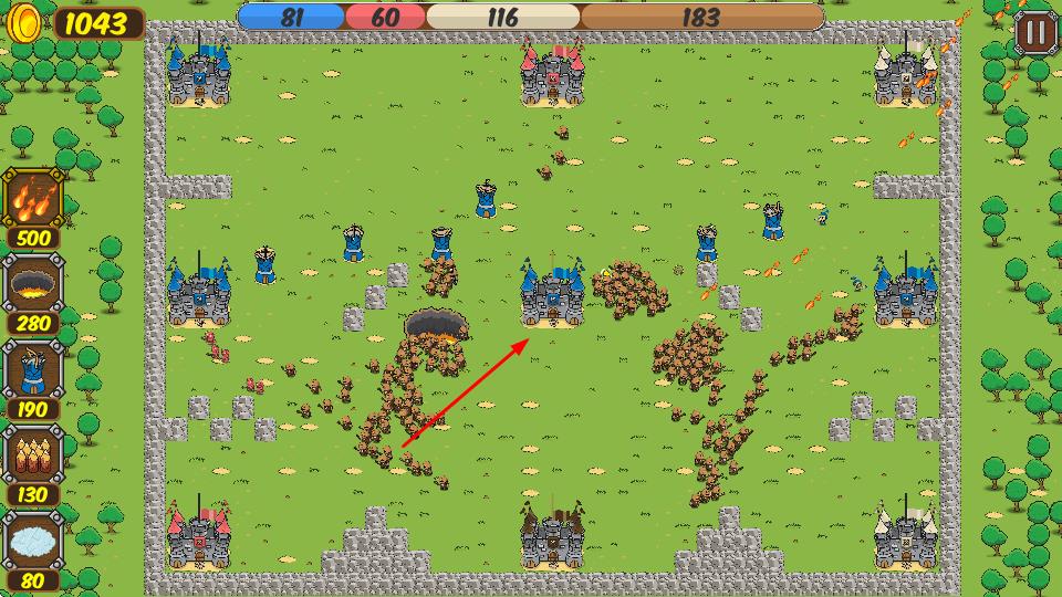 3、中后期,指挥多兵种部队,进攻敌方城堡,结合技能(火焰等),争夺领地,提升资源与势力。