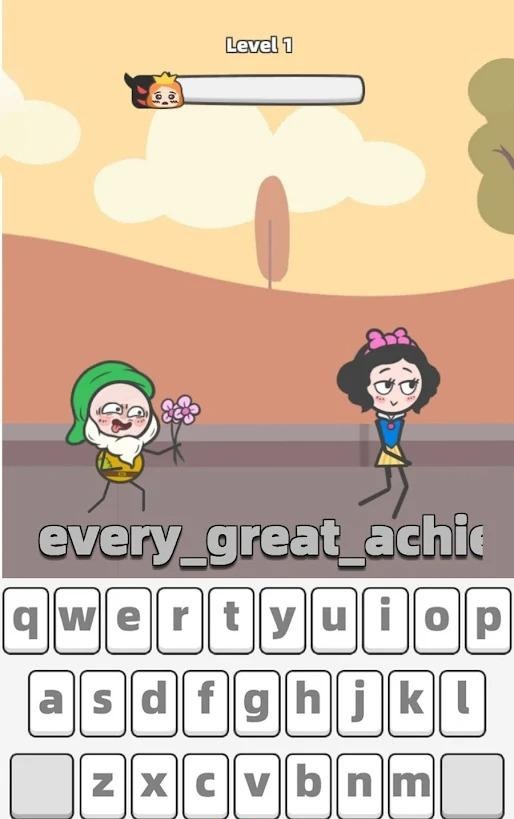 3、Level1关卡,结合角色(小矮人送花白雪公主),补全“every_great_achie”单词,解锁新关卡。