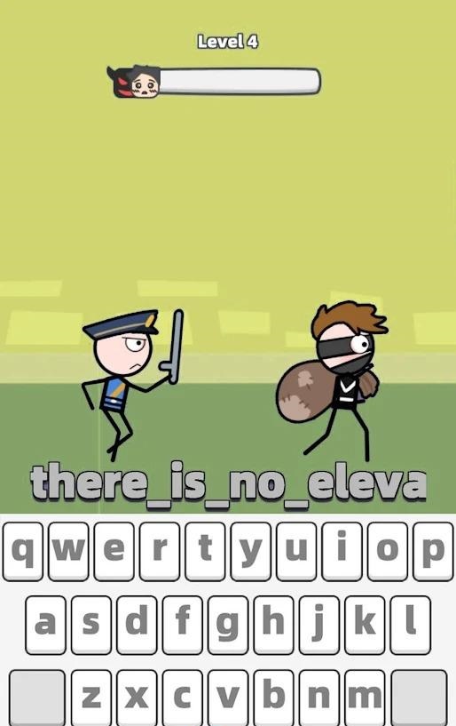 1、在Level4关卡,观察场景(警察与盗贼),点击字母键盘,补全“there_is_no_eleva”单词,推进解谜。