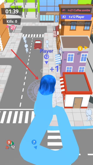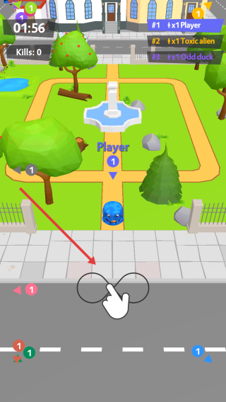 3、后期在城市、公园场景,利用地形围堵、偷袭对手,持续吞噬涨等级与体积,关注时间与剩余玩家,争取登顶排行榜,赢取胜利。