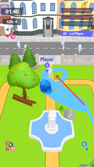2、等级提升后,沿路径拓展,吞树木、道具扩大体积,遇低等级对手可攻击吞噬(看“Kills”计数),同时留意排行榜,避让高名次强敌。