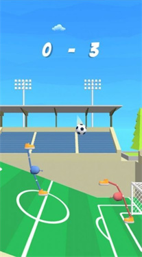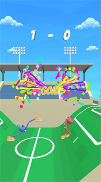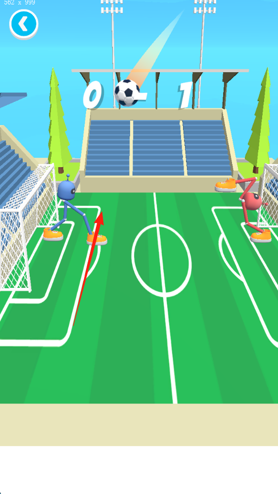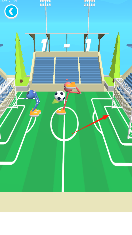 2、实时对抗利用物理引擎,操作角色(蓝红),通过拉伸、弹跳,争夺空中足球,射门得分(比分0-1→1-1)。