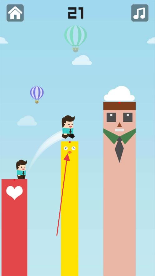 3、职场角色关卡,点击屏幕使人物跳跃,从红色方块到黄色方块,避开障碍,持续向上闯关。