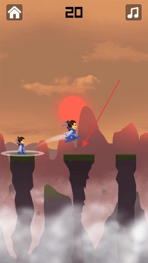 2、武侠场景,控制蓝衣角色,长按蓄力,跳跃跨越悬崖,落在对面平台,推进关卡进度。