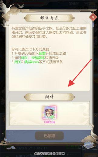 1、查看邮件,根据指引升级到80级,加入仙盟,或刷副本、挑战boss变强。