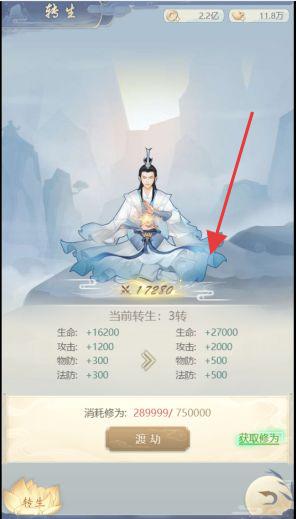 3、进入转生界面,积累修为,点击渡劫,完成转生提升角色属性。