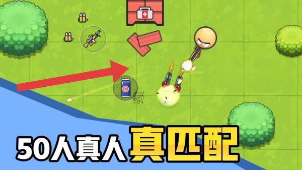 3、呈现了其“50人真人匹配”的玩法场景,有角色、武器、道具(急救包、饮料等),符合卡通风格的生存竞技模式。