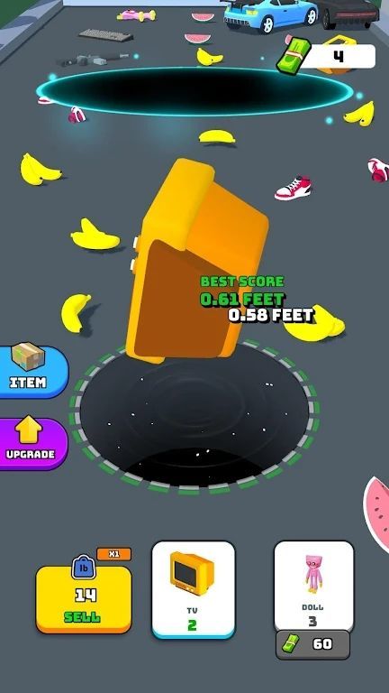 2、道具策略网络:场景中分布多种功能道具,加速道具提升移动速度,范围道具扩大吞噬半径,磁铁道具吸引远处物体,合理规划道具使用顺序提升吞噬效率。