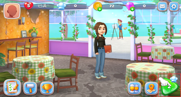 1、下载安装完成后进入游戏,这里我们点击屏幕右下方的按钮,即可开启餐厅翻新与经营之旅。