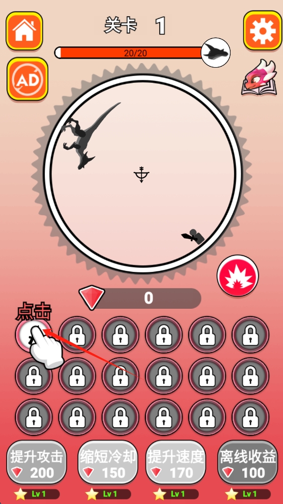 1、基础操作:鼠标点击选择武器与操作区域,Q/E键切换武器,R键重置关卡,F键使用技能,C键打开商店,M键打开地图,N键查看任务,Tab键切换恐龙信息。