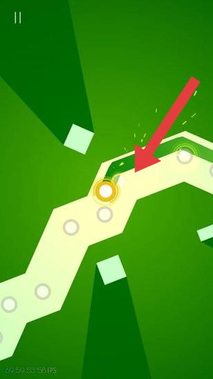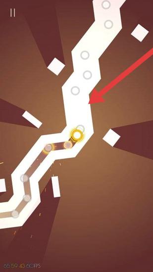 3、继续操控金色圆环沿绿色折线轨道行进,依照红色箭头指引的方向,留意轨道转弯处,避免圆环脱离轨道,持续推进游戏进程。