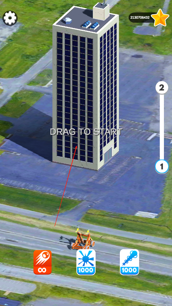 1、进入游戏后滑动屏幕调整投石车角度,点击屏幕蓄力发射炮弹,首次闯关需击中大楼薄弱点完成基础拆除操作。