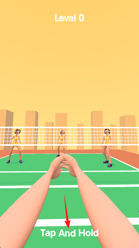 1、操作指引“TapAndHold”点击长按,控制双手发球,在“Level0”基础关,与黄色方(黄队)对抗。