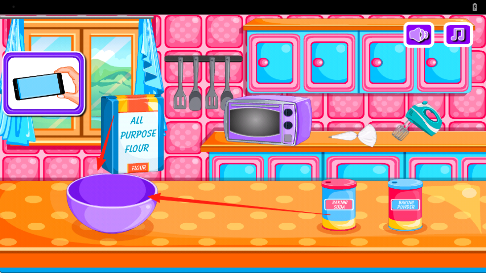 3、按箭头提示,把【ALLPURPOSEFLOUR】加入紫色碗,接着可添加【BAKINGPOWDER】辅助烘焙。
