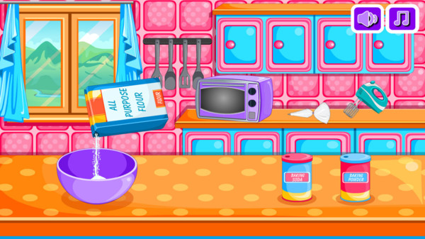 2、先将【ALLPURPOSEFLOUR】倒入紫色大碗,再按指引添加【BAKINGSODA】准备制作。