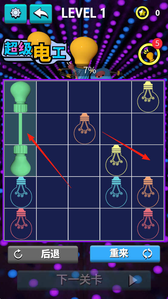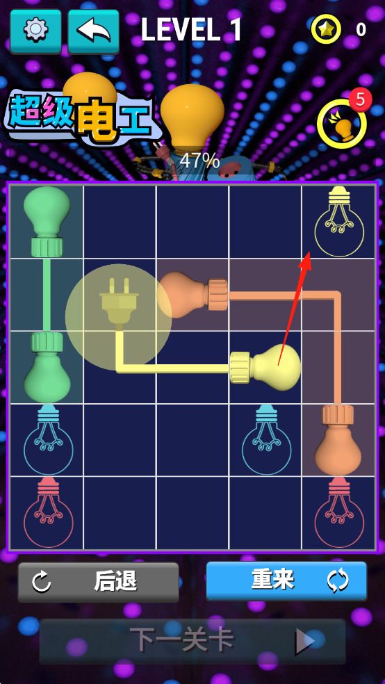 3、按箭头指引,依次连通各颜色灯泡线路,全部点亮后,即可通关进入下一关卡。