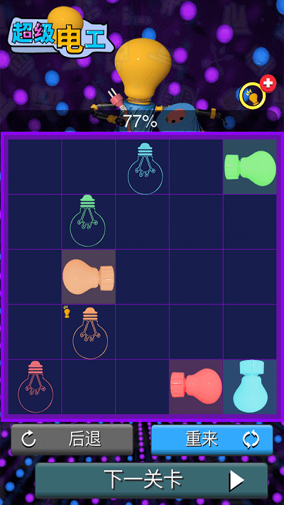 超级电工Super electrician是一款以电路连接为核心的休闲益智作品,玩家将化身城市电工,在错综复杂的电路迷宫中挑战逻辑思维极限,以零缠绕精准连接为规则,需在限定网格内将同色灯泡与电源正确连通,避免线路交叉缠绕,通过点亮所有灯泡恢复城市电力从单线路简单关卡到多色混连的复杂电网,难度循序渐进,兼具休闲性与烧脑感。