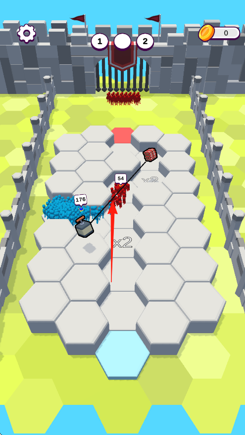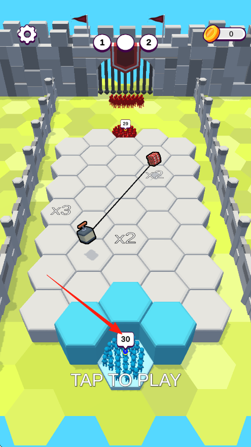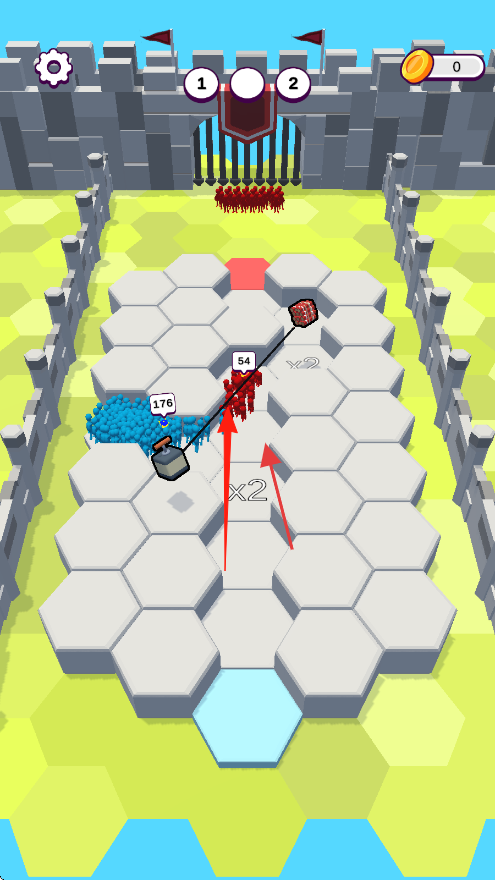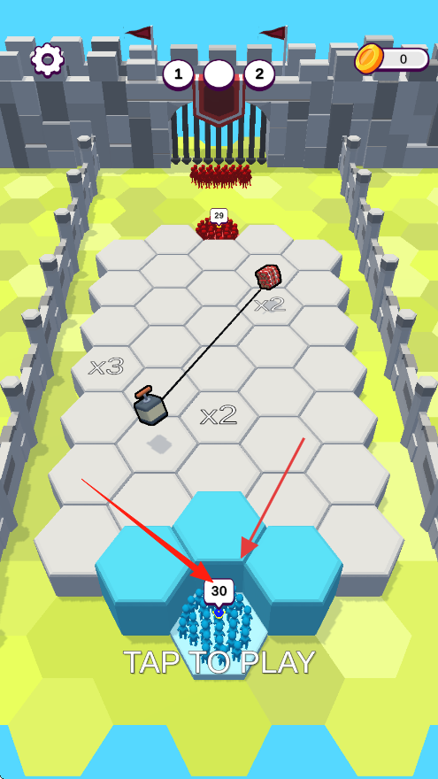 3、推进关卡,占领关键格子(如增益格),积累部队数量,向城堡据点进攻,突破敌方防线。