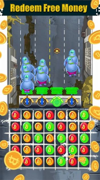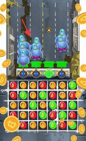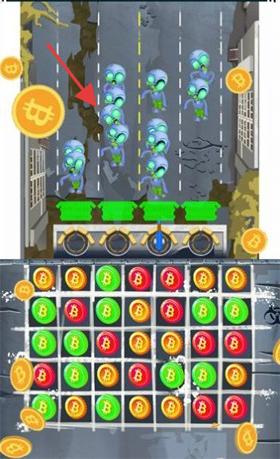 1、消除金币:点击同色金币(如绿色、红色),完成三消,攻击上方怪物。