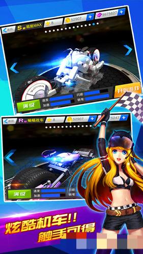 3、名车改装系统:有精良的真实世界级别品牌名车,各大名牌摩托可供驾驭,融合流行火爆的改装车竞速文化,配合强大升级装备系统,满足玩家个性需求。