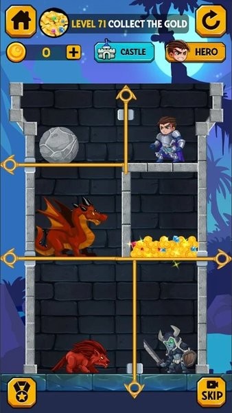 3、夺金关卡(LEVEL71),规划机关(横杆)操作顺序,避开恶龙、敌人,引导英雄取金币。