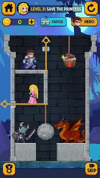 2、救公主关卡(LEVEL31),观察机关(绳子、石块),点击移除,让英雄避危险,救公主。