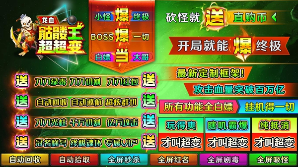 龙血骷髅王超超变是一款将魔幻与策略完美融合的角色扮演传奇手游,玩家将化身为强大的骷髅王,运用龙血之力,勇闯未知世界,征服各大皇城,游戏提供丰富的社交系统,让玩家能够结交志同道合的伙伴,共同成长探险,凭借精美华丽的画面和多样的副本挑战,这款手游带你在复古传奇的世界中体验前所未有的冒险乐趣。