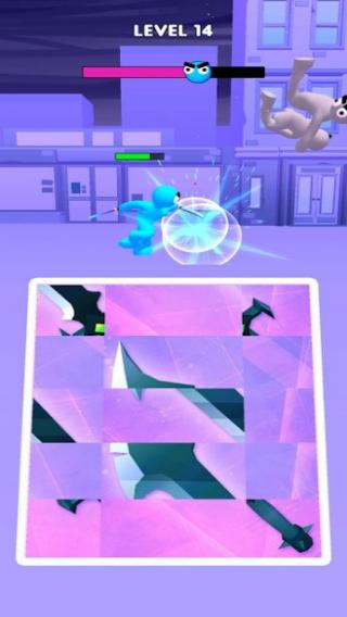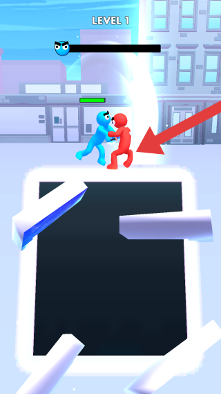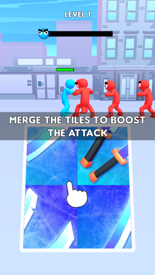 2、处于“LEVEL1”,玩法提示“合并方块提升攻击”,呈现红蓝火柴人对战、合并方块操作界面,属于动作与合成玩法结合的休闲,核心是通过合并增强攻击进行战斗。