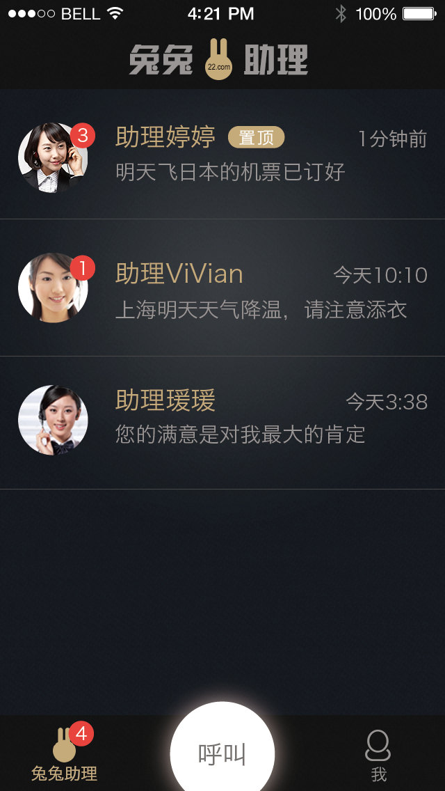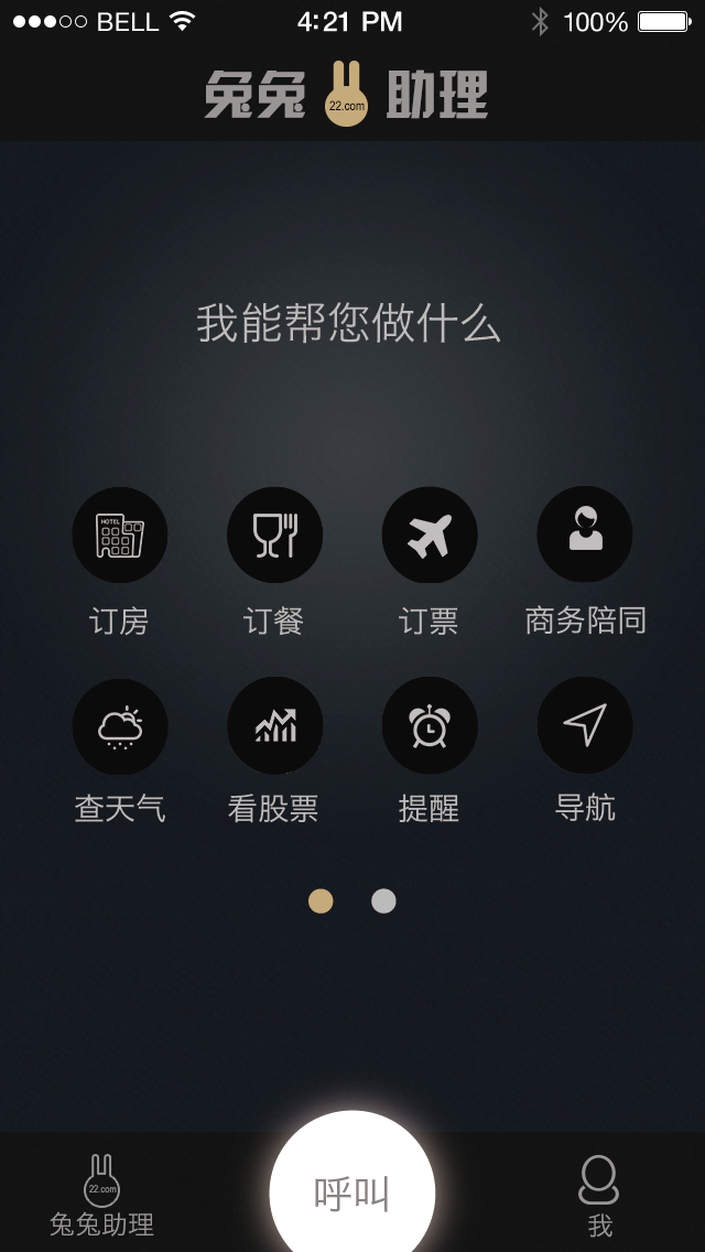 兔兔助理帮你手机在线一键预订酒店、订餐、订票、查天气、看股票、提醒、导航,实时的为你提供便捷的服务,我们为你提供特新的服务,做你值得信赖的管家,在线客服24小时为你提供服务,一对一的交流模式方便你的生活就是对我们最大的肯定。