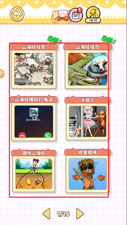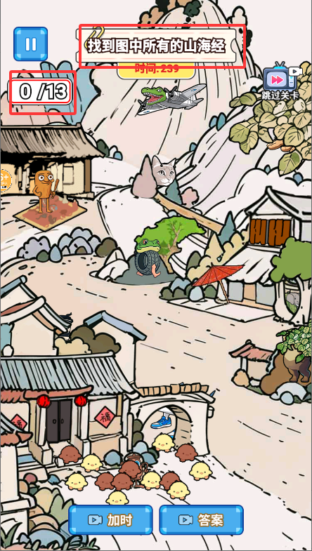 3、进入关卡后,根据头顶的目标,找齐十三个山海经即可过关。