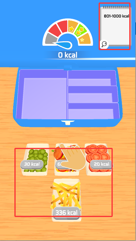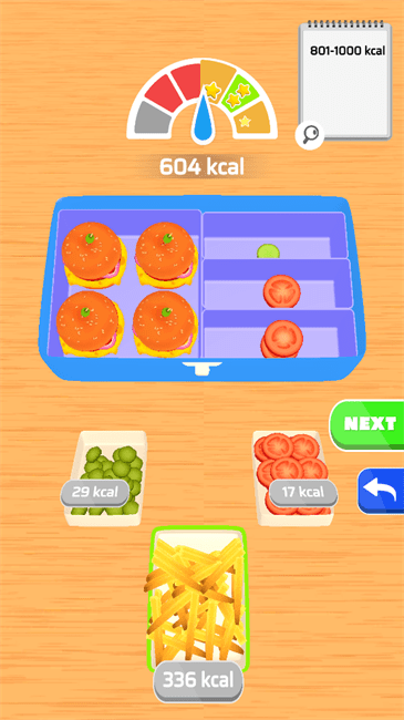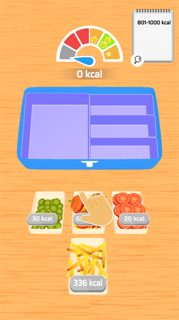 2、营养计算系统科学精准,实时显示餐品的热量和营养比例,每种营养素都有明确的达标要求,特殊"健康达人"挑战需要完美配比。