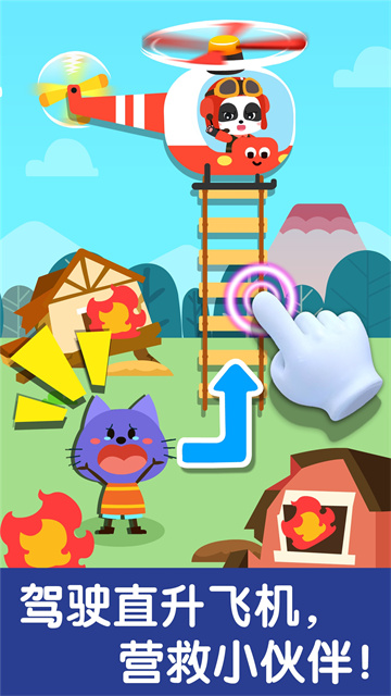 3、消防车体验中,孩子需操作水枪对准燃烧标志,连续点击以灭火为目标,培养专注力与快速反应能力,同时学习消防知识。