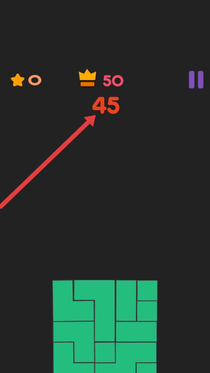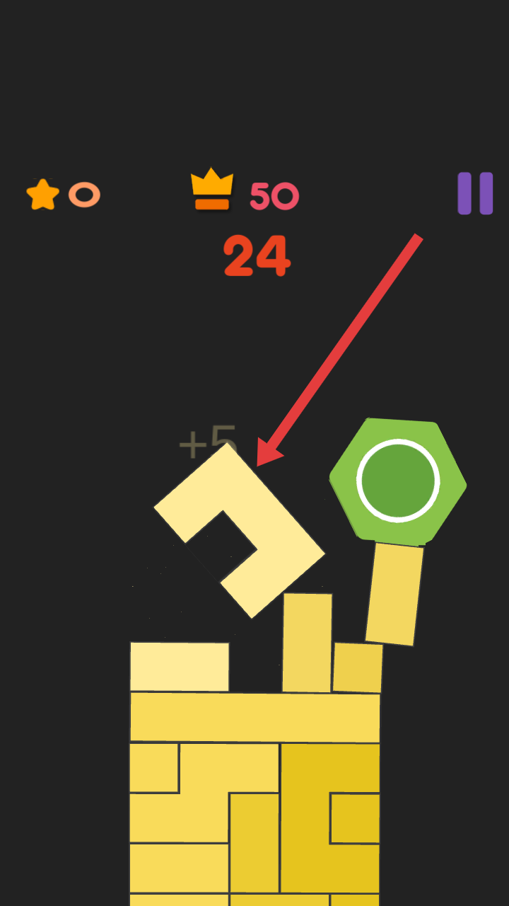 2、游戏过程中持续点击,让方块下落堆叠,维持绿色六边形稳定,通过方块拼接积累分数(如+5),推进关卡进程。