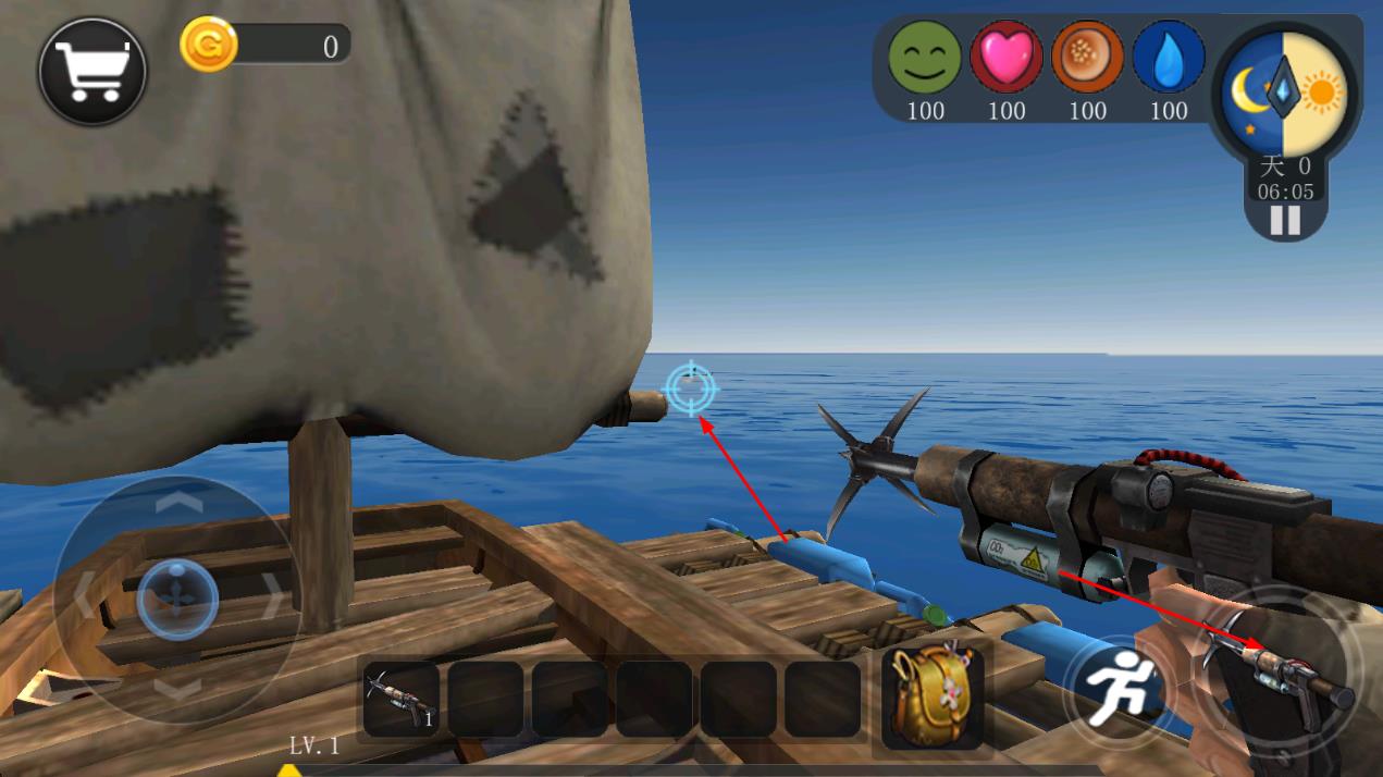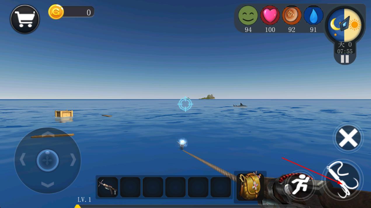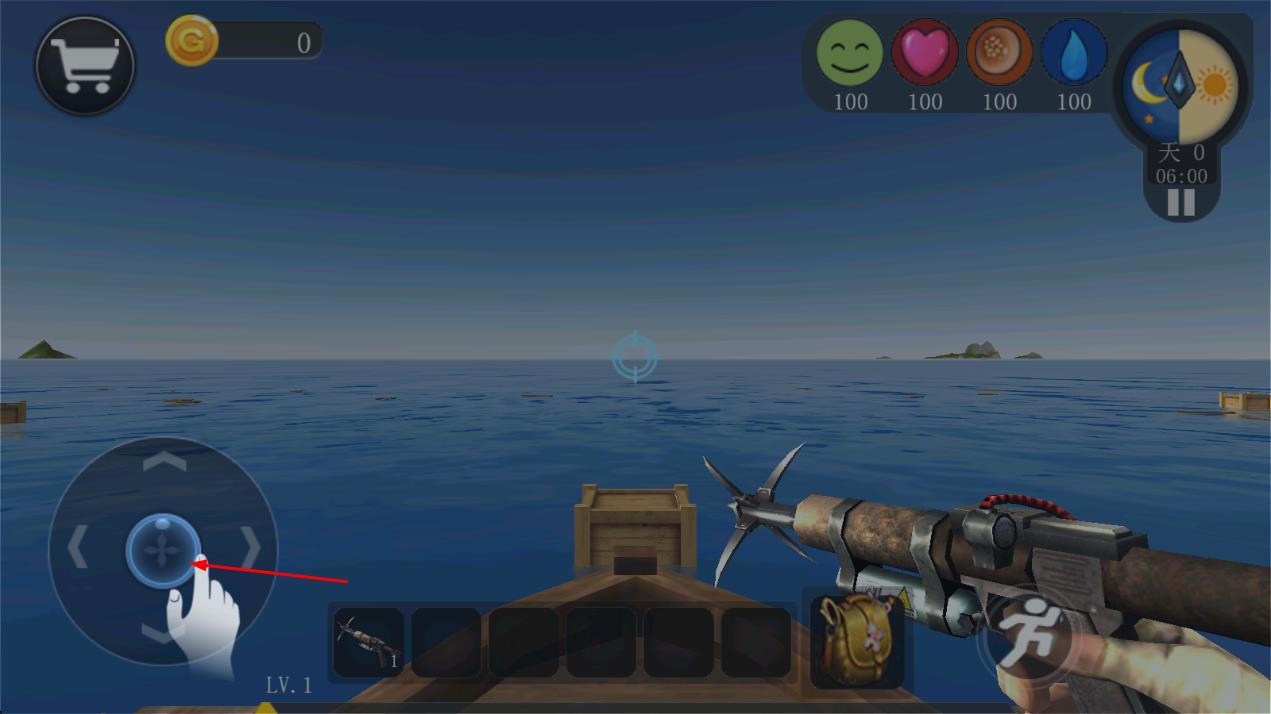 1、进入游戏后操控木筏打捞漂浮的木板塑料瓶,制作简易鱼竿捕鱼,收集基础生存物资搭建初始避难所。