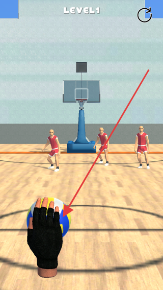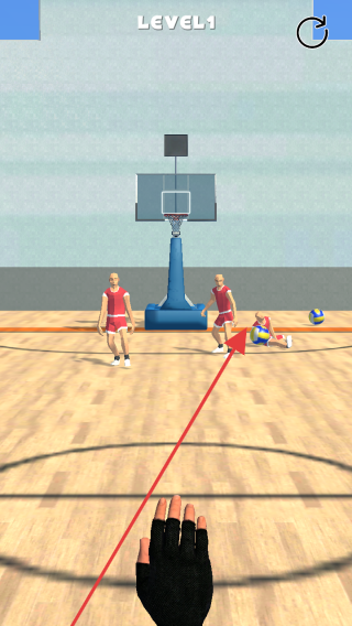 3、瞄准篮筐,避开场上穿红色运动服的防守球员,将篮球投出,完成关卡任务。