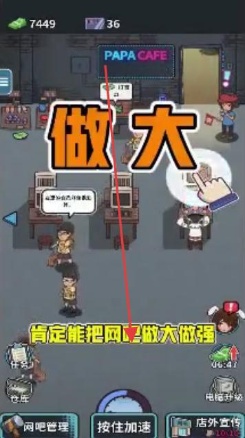 2、在游戏内点击“做大”相关操作(如手指提示处),升级网吧设施,提升经营规模,积累资源。