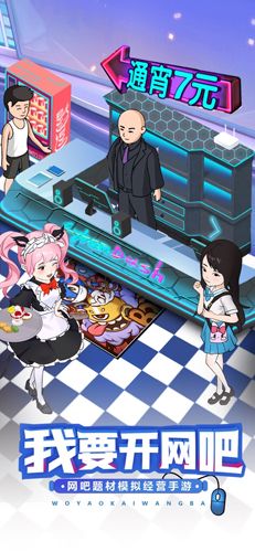 1、进入《我要开网吧》游戏,开启网吧经营之旅,画面有卡通角色和网吧元素,按提示开始。