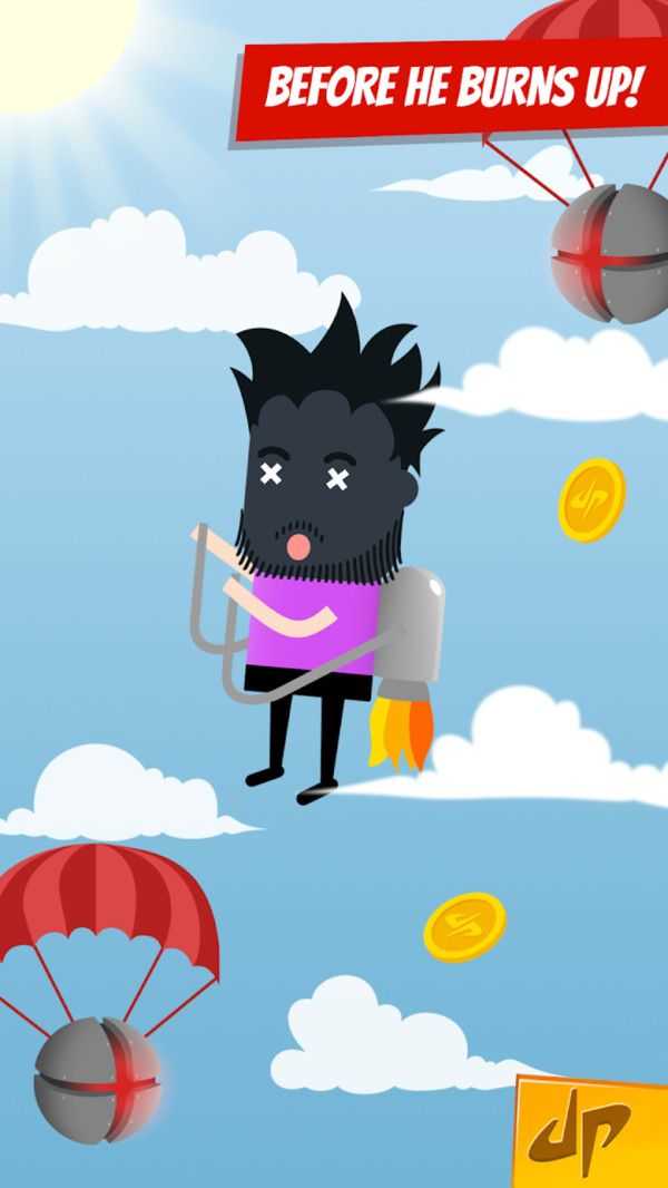 3、操控角色在空中飞行时,躲避带降落伞的炸弹等障碍物,收集金币,提升分数,持续挑战高分。