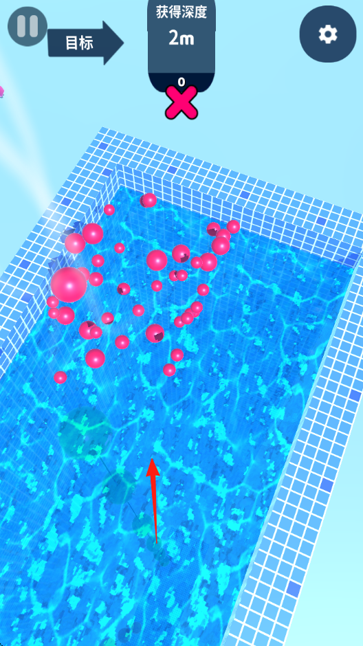 1、玩法机制控制粉色角色,从泳池边高处跳入水中,通过调整姿势(图1仰卧),在下落时刺破粉色气泡(图2),增加入水深度(目标2m→3m)。